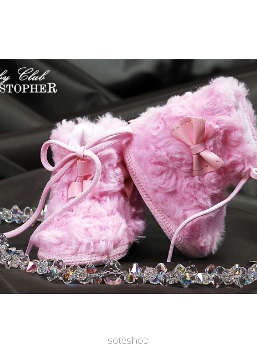 Całe buciki są z bardzo mięciutkiego futerka, które ma włosek delikatnie układający się we wzór kwiatowy a z boku bucików są ozdobne kakardki ze skórki.